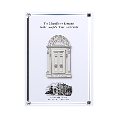 This beautifully detailed depiction of the White House Entrance is etched on 100% brass bookmark and mounted on a card perfect for gifting. At the top, careful engraving to show the stone rose detaling around the doorway, and below text reads "The White House" for the perfect memento and practical bookmark. Push back the door to slide the bookmark into your book to save your page! Finish is silver in appearance, 100% Brass with Rodium finish.