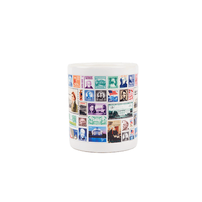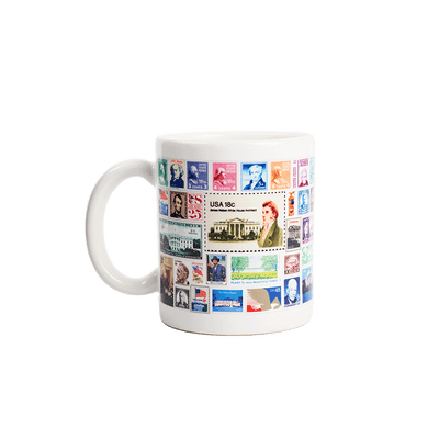The USPS Stamp Collage Collection features official USPS stamps with images of the Presidents and White House over the years. This heavyweight mug is designed and made in the USA and a features a durable graphic print to be enjoyed for years to come. Base of mug is prominently stamped with "made in USA".