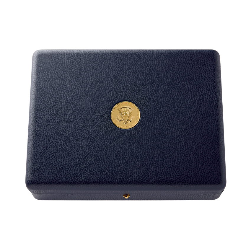 Navy leather presentation box with Truman Seal inlaid coin. On October 25, 1945, President Harry S. Truman issued Executive Order 9646, which officially defined the Presidential Coat of Arms and Seal for the first time. An eagle’s head, which originally faced right toward a bundle of thirteen arrows held in its talons, was turned to face left toward the olive branch it held, symbolizing peace. Since 1945, the only changes made to the seal were the additions of the 49th and 50th stars.