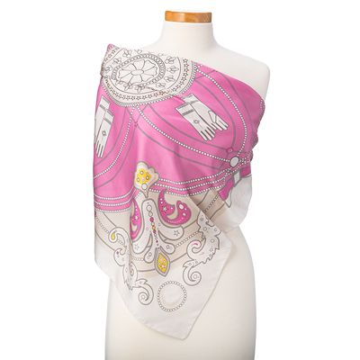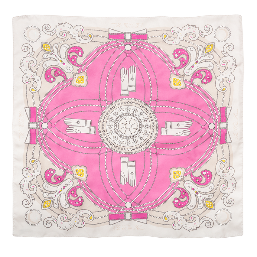 Jacqueline Kennedy’s time as first lady from 1961 to 1963 was distinguished by her extraordinary support of the arts and historic preservation, but she is also remembered for the classic elegance she brought to White House décor and entertaining. Today, Mrs. Kennedy remains a style icon for her own timeless and feminine approach to fashion. The pearls, white gloves, and bows with which she accessorized her pastel gowns inspired the design of this scarf, offered exclusively by the White House Historical Association.