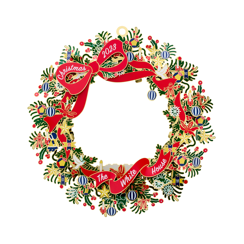 Introducing our 10-inch decorative replica of the Official 2023 White House Christmas Ornament. This piece is a festive holiday wreath adorned with decorations inspired by the handcrafted Christmas ornaments used in the White House during Gerald R. Ford’s presidency. On the back, emblems commemorate the life and presidency of Gerald R. Ford. It’s the perfect eye-catching decoration for hanging on your wall or door to celebrate the tradition of Christmas at the White House.