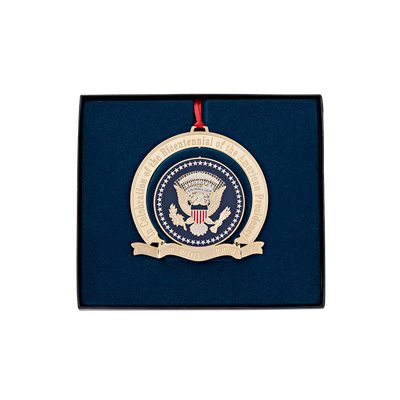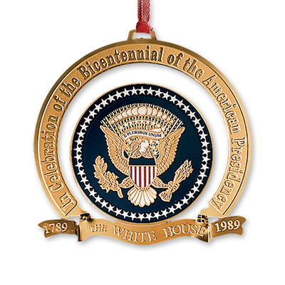 The White House Christmas Ornament for 1989 celebrates the 200th anniversary of the Presidency of the United States with a replica of the official seal of the president. This familiar emblem accompanies the president on all official occasions. It decorates the platform where he speaks and it is a familiar feature of his public appearances. It is this seal that President Rutherford B. Hayes adapted in 1880 to a coat of arms for the president.