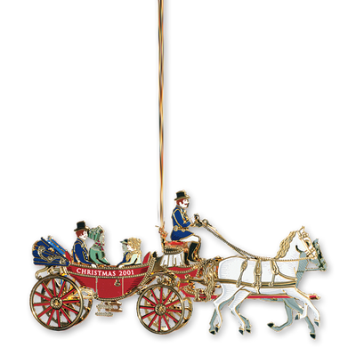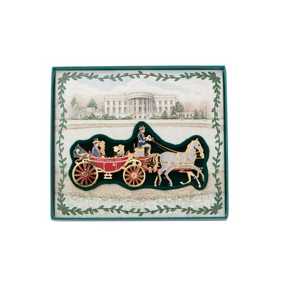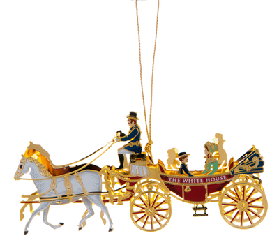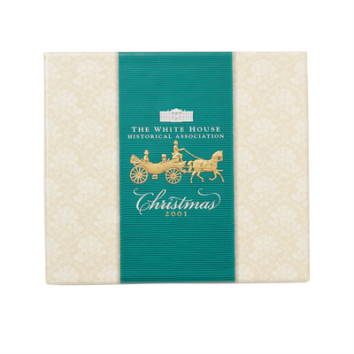 The 2001 official White House ornament features a three-dimensional replica of a carriage of the type used by President Andrew Johnson. Beautifully crafted, it has a 24kt. gold finish and enameled colors. Andrew Johnson often took carriage rides out into the surrounding countryside to relax with his family after a stressful day of politics in the White House. This year's ornament is uniquely displayed within packaging that includes an antique engraving-style illustration depicting the carriage returning to the White House at Christmas in 1867.