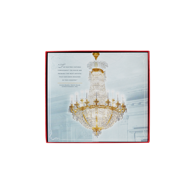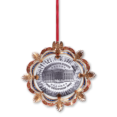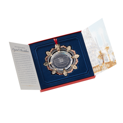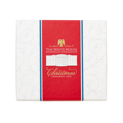 The crystal-like acrylic core of the 2002 Official White House Christmas Ornament recalls the sparkling Bohemian glass of the elegant East Room chandeliers. The brass metal decorative frame includes a holiday ribbon, acanthus leaves from the East Room's Louis XVI style wall panels, and a sturdy eagle, inspired by the carved mahogany pedestals of the console tables.