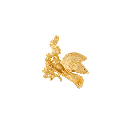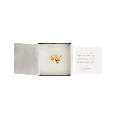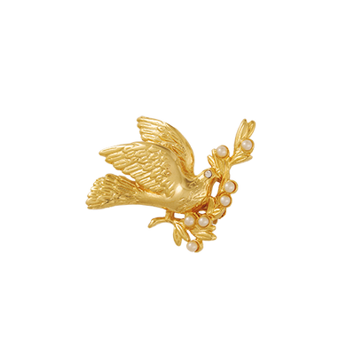 A beautiful gift and symbol of the peace to carry with you always. This delicately made pin features a peace dove with olive branch adorned with faux pearls. Made of brass and clad in 18k gold. Arrives in black gift box with gold bow.
