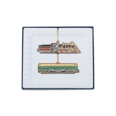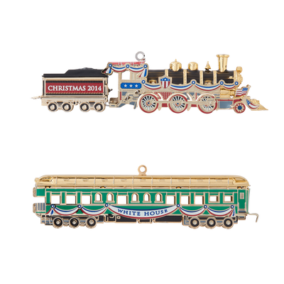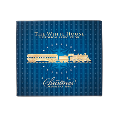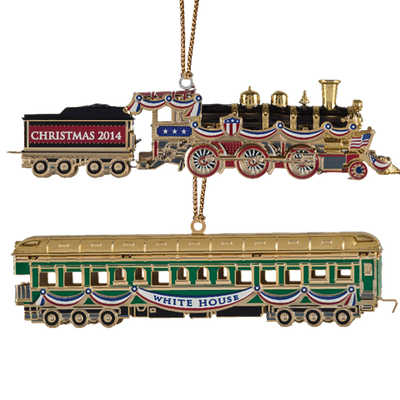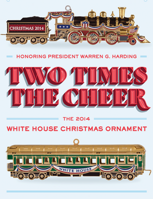 The 2014 official White House Christmas ornament honors the administration of Warren G. Harding, who served as the twenty-ninth president of the United States from 1921 to 1923. As a young boy, Harding dreamed of being a locomotive engineer—a wish that was to come true for 51 minutes when as president, he took over the controls on the Alaskan railroad during the “Voyage of Understanding,” his famous transcontinental speaking and sightseeing tour. The Presidential Special, the train that carried President Harding west at the outset of his ambitious voyage and that would tragically carry his casket back east following his sudden death, just two months later, is the inspiration for our train Christmas ornament for 2014. Decorated with gold tones and enamel finishes, the 33rd annual White House Christmas Ornament is our first ornament to be comprised of two pieces, which can be hung as two separate ornaments or linked together. The locomotive is a detailed miniature replica of one of several steam-powered locomotives that pulled the Presidential Special; it is attached to the coal car that held its fuel. The other miniature car is the Superb, the president’s private heavyweight Pullman car. The last car on the Special, the Superb was outfitted with a public address system. President Harding made appearances and delivered speeches at stops across the country from a platform at the back of the car. The last known photograph of President Harding is an image of him on the Superb shortly before his death in a San Francisco hotel on August 2, 1923. On August 3, President Harding’s casket was placed on board the Superb and began a return trip to Washington, D.C., during which an estimated 3 million people paid their last respects.