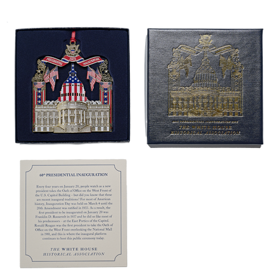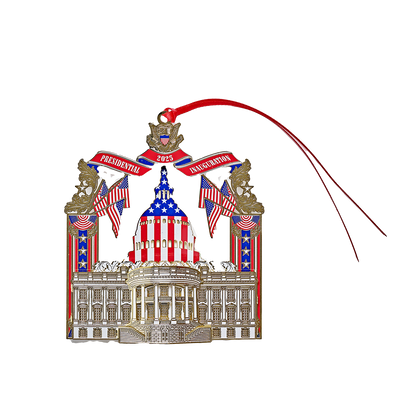 Commemorate the 60th Presidential Inauguration in 2025 with this USA made, brass ornament finished with 24K gold. Exceptionally detailed, etched designs depict a South Portico view of the White House on one side and the West Front of the U.S. Capitol Building on the opposite side. Adorned with USA flags and stars, this ornament also features headline text "2025 Presidential Inauguration".
