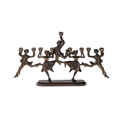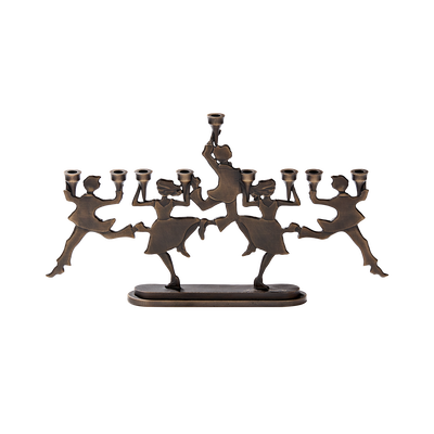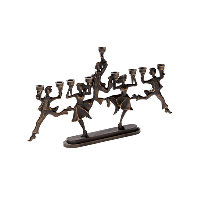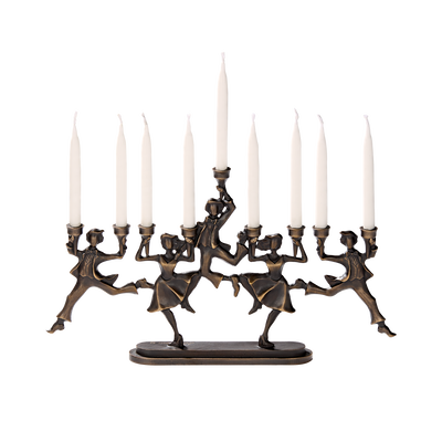 Created by artist Zachary Oxman exclusively for the White House Historical Association, this menorah celebrates life under the Hanukkah Lights. Leaping into the air, the central figure raises the Shamash high (the candle used to light the others in the menorah). This signed and numbered bronze sculpture is a small scale sculpture based on a series of of bronze menorahs Oxman created for exhibition in the White House during the presidency of William J. Clinton.