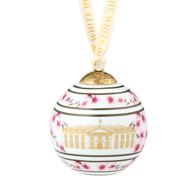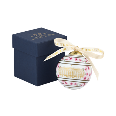 This elegant, English Fine Bone china 3" bauble ornament is handcrafted and beautifully decorated and accented with gold. The bauble depicts both the north and south views of the White House surrounded by impeccably detailed watercolor cherry blossom flowers. This item arrives boxed with gold foil branded imprint, perfect for gifting. Halcyon Days pieces are designed to last, this bauble has been hand-decorated in the UK by their master craftsmen and women. Each bauble showcases the skill of their artisans, based in Stoke-on-Trent, the heart of the English pottery industry.