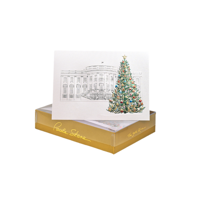 We set out to capture the beauty and elegance of the White House at Christmas and this set of six embossed greeting cards does just that. Presented on a white satin card, a depiction of the South Portico of the White House is embossed in gold with exquisite detail. Also featured, is a festive holiday tree complete with foil embossed ornaments, invoking the pride of our National Christmas Tree which stands tall in the ellipse just south of the White House lawn each year. Each card comes with an envelope. Inside is printed with "season's greetings", the perfect card for everyone on your list this year!