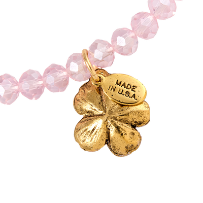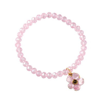 Strut the stackable bracelet trend with this pink crystal elasticated stretch beaded bracelet with pink enameled cherry blossom charm. The bracelet is made in the USA and has a small "made in USA" charm. Wash with mild soap, dry with soft cloth. Choking Hazard. Do not put in mouth. Keep out of the reach of small children.