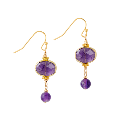 Discover these unique faceted purple amethyst 1 1/2-inch drop earrings with gold accents. Each hand-carved amethyst wedge is encased in vermeil trim on a dainty ear wire. Inherent to the hand carved stone craftsmanship is slight natural variations in color and size. Gold-plated pewter for a touch of casual elegance.