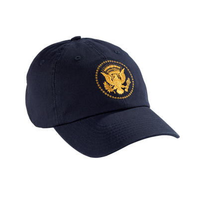 On October 25, 1945 President Harry S. Truman issued Executive Order 9646, which officially defined the Presidential Coat of Arms and Seal for the first time. An eagle’s head, which originally faced right toward a bundle of thirteen arrows held in its talons, was turned to face left toward the olive branch it held, symbolizing peace. Since 1945, the only changes made to the seal were the additions of the 49th and 50th stars. This adjustable navy hat features the Truman Seal in gold.