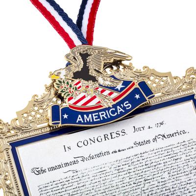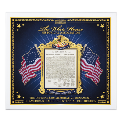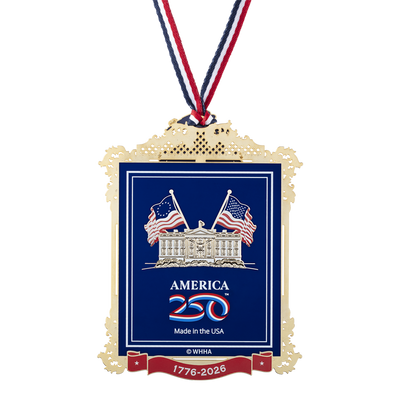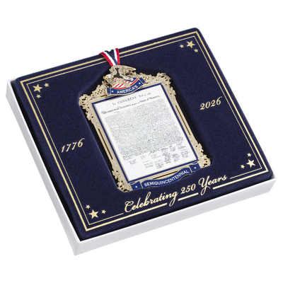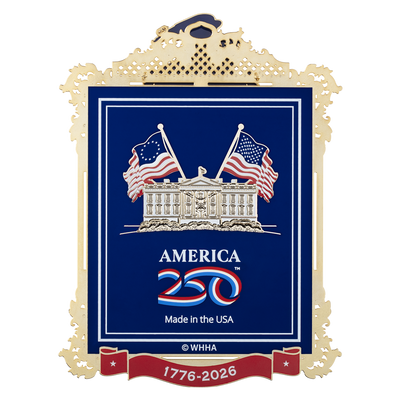 Commemorate America's historic 250th anniversary with this distinguished Official Commemorative ornament, designed by the White House Historical Association and licensed by the America250 organization. This ornament is an iconic addition to our celebrated Official White House Ornament collection and is our Official 2026 White House Christmas Ornament. The front showcases the foundational text of the Declaration of Independence, delicately printed on linen and mounted within an exquisitely detailed brass setting, enhanced with 24-karat gold finishing for timeless radiance. The reverse reveals an artfully etched White House, adorned by both the Old Glory flag and the contemporary American flag in graceful tribute. Thoughtfully designed and hand-crafted in the USA, this ornament transcends seasonal decoration—it embodies the spirit of American independence and serves as a symbol of our nation's enduring values, perfect for passing down through generations.