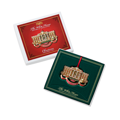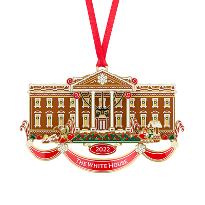 2022 Ornament: The White House Historical Association's Official 2022 White House Christmas Ornament represents the cherished White House tradition of displaying a gingerbread house each holiday in the State Dining Room. A perfect addition to any holiday tree, this American-made holiday ornament illustrates this decades-long tradition, complete with delicate icing, red and white striped candies, gumdrops, and candy canes. If you look closely, you can even see little gingerbread children frolicking in front of the North Portico. Included with this beautifully gift-boxed keepsake is a gingerbread scented insert, booklet, and recipe card featuring a gingerbread recipe from First Lady Pat Nixon's time at the White House.