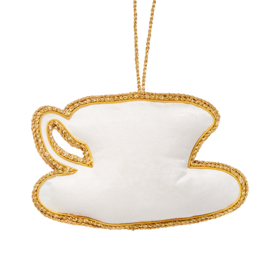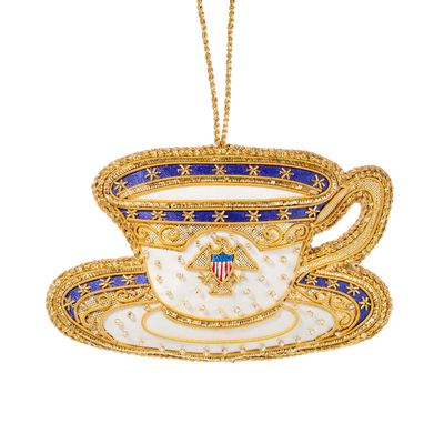 Many presidential administrations order unique State China Services for use in official White House entertaining. The designs reflect changing tastes of presidential families. In 1934, during the administration of President Franklin D. Roosevelt, Eleanor wanted to promote American companies leading to a purchase of dinner and dessert service from Lenox in New York. The service is rimmed in a marine blue with 48 stars to represent every state, in addition to the presidential seal prominently displayed below the stars. This whimsical felt ornament features that same pattern on a teacup and would look perfect on any tree.