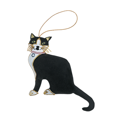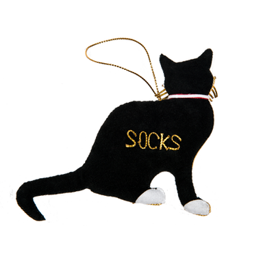 Socks, a stray cat, was adopted by President Bill Clinton’s daughter Chelsea. He moved into the White House with the family during Clinton’s administration. “SOCKS” is written in gold thread on the back of this new ornament. Felt, with gold loop.