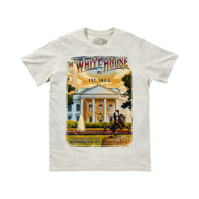 Inspired by vintage travel posters, this White House graphic t-shirt is a first for the White House Historical Association. Each one is individually hand-dyed, making it one-of-a-kind, and then enzyme washed for ultimate softness. The marbled wash has highs and lows meant to mirror the stone texture of the White House itself. The original, exclusive artwork is printed with soft, breathable, eco-friendly inks that only get softer over time. This luxurious 100% cotton, USA-made t-shirt will be your favorite for years to come. Features exclusive "The White House Historical Association" interior back neck label. Unisex sizing.