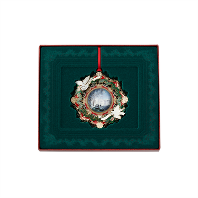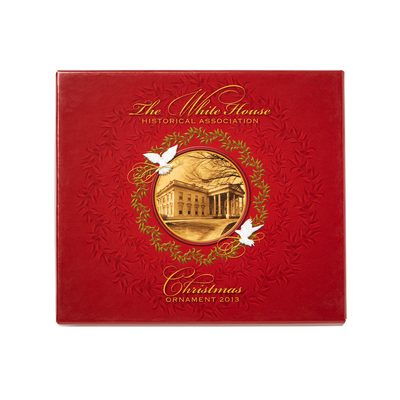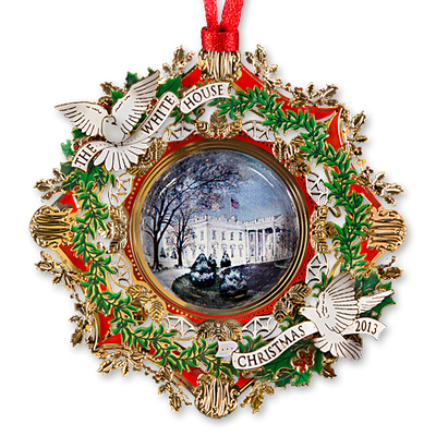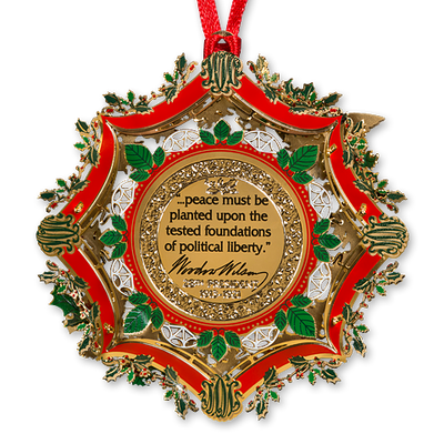 The 2013 official White House Christmas ornament honors Woodrow Wilson, the twenty-eighth president of the United States. The years of Wilson's two terms in office, from 1913 to 1921, are defined by the unprecedented devastation of World War I, yet Wilson himself would be awarded the Nobel Peace Prize in 1919, and his life is distinguished by his resolve that the Great War would truly be the war to end all wars. It was President Wilson's extraordinary quest for a lasting world peace that inspired the design of our ornament. The centerpiece of the White House Christmas ornament for 2013 is an American Elm tree planted by President Wilson on the North Lawn of the White House on December 18, 1913, just before Christmas. This snowy scene is surrounded by a 24-karat gold-finished frame comprised of elm leaves on the innermost circle, a wreath of olive branches in the middle, and holly leaves bordering Wilson’s monogram on the outermost circle. Two peace doves perch upon the olive branches, bearing banners that announce “The White House, Christmas 2013.” The words inscribed on the reverse side of the ornament were delivered by President Wilson in his War Message to Congress of April 2, 1917: “Peace must be planted upon the tested foundations of political liberty.”